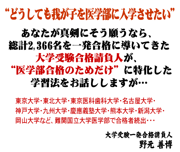 世の中には、わざわざ遠回りして難関国立大医学部に入る方法が溢れていますが、そういったことは一切省いて、これまでの医学部合格生が実際にどのようにカリキュラムを組んでいたのか?そして具体的にどのように学習していたのか?それら、つまり実績に裏打ちされた「最短で合格できる最も確率の高い方法」を公開しています。