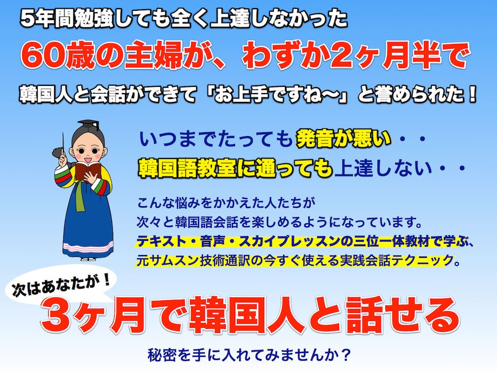 元・サムスンの日本人技術通訳が教える韓国語光速インストール学習法は、多くの時間を費やして勉強しても、韓国語が一向に上達しない…とお悩みの方に向けた上達プログラムです。
