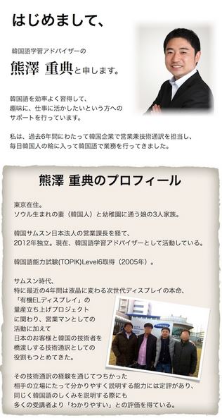 作者の元・サムスン技術通訳 熊澤重典氏が韓国語が全くできないところからサムスンで通訳業務を行うに至るまでに経験したことを教材内に惜しみなく盛り込んでいます。