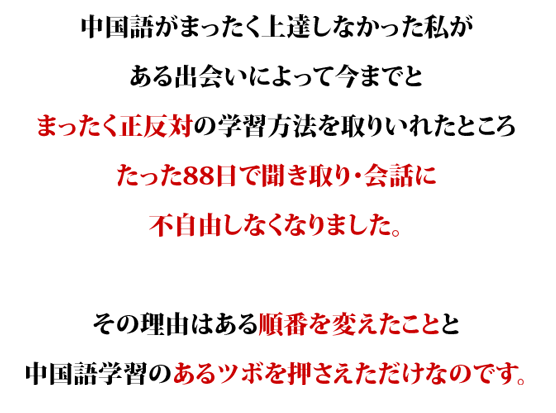 あなたも、公開後わずか半年足らずで3000人以上の方が実践した「中国語上達のツボ」に興味を示していただければ、わずかな努力と最低限の費用で中国語を習得することができます。